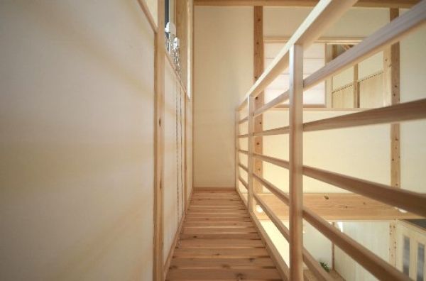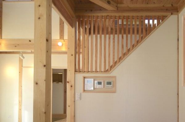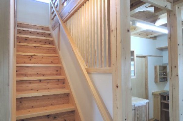 桧無垢で手刻みの階段、同じく桧の階段角テスリ