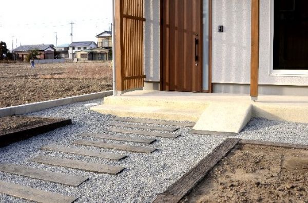 枕木のアプローチ、二輪車スロープ、玄関ドア左の縦格子ブラインド