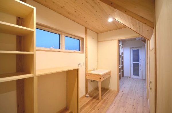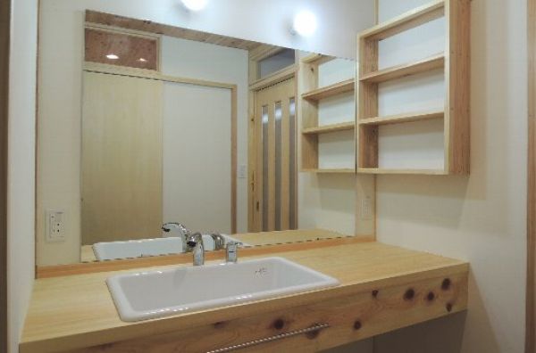 桧無垢の洗面カウンター・幕板、洗面器はTOTOの病院用流し