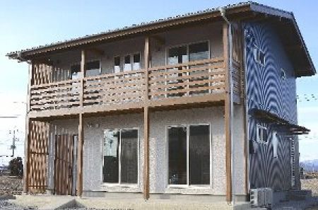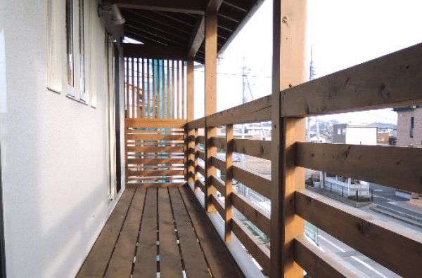 広い桧のバルコニーはプラネットの自然塗料、外壁は塗り壁のスーパー白州そとん壁
