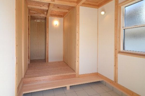3坪の玄関とホール、桧無垢の式台
