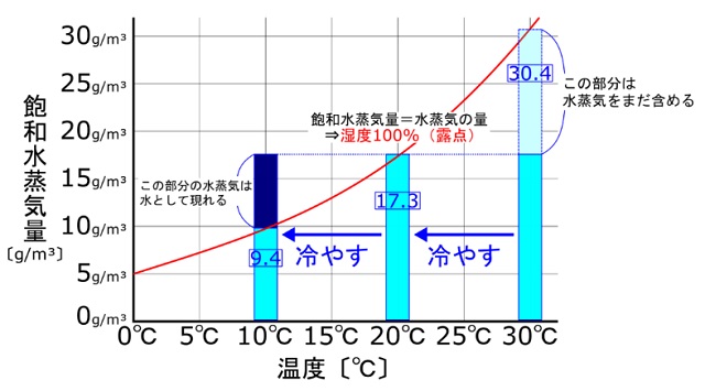 また、空気中の飽和水蒸気量が最大のときが「湿度100%」であり、一定の水蒸気量で空気が冷やされていくと「湿度100%(露点)」となり、更に空気が冷やされると100%を超えた分の水蒸気が水滴(結露)となるわけです。