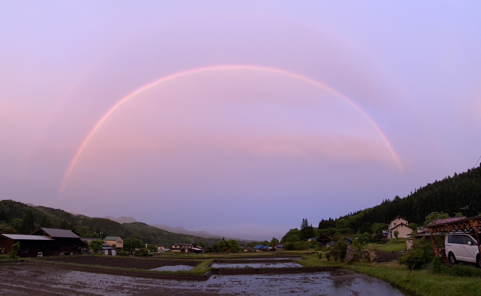 愛弓さんが、すっごいでっかい虹が出てるけど見た?と家の中で話していると、「そんなはずはない」という雰囲気を出しながらも「でも気になる~」という感じが出ちゃってる中澤家の子供たちと共に外に出ました。僕も最初は「ただの虹でしょ?」と思っていたんです。しかし、外に出てみると本当にすっごいでっかい虹が出ていました(笑)。しかもダブルレインボー!これにはビックリしました。