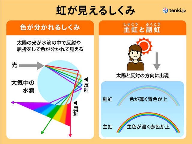 虹が見られる原理は、太陽の光が空にある水によって反射されて僕たちの目に届くことで見ることができます。ダブルレインボーの色の順番が逆なのは、大気中の水滴へ入る光の向きが上から入るか下から入るかによる違いらしいのです。