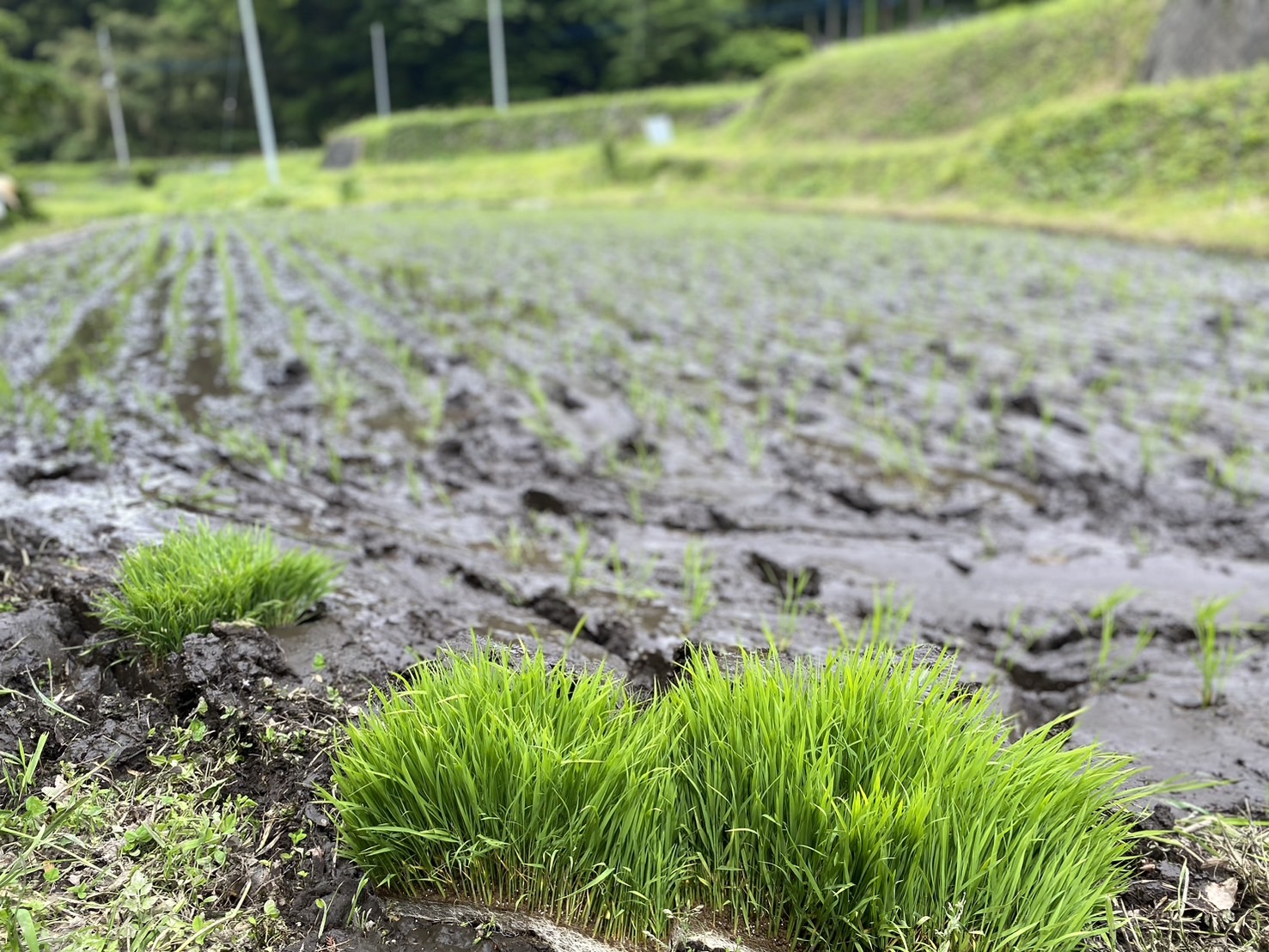 少し前に康之さんから「19日田植えする予定なんだけど。」と話がありました。「二年目なので戦力として考えといてください(笑)。」と返事をして、すぐにスマホのカレンダーに『田植え』と登録してしまうくらい楽しみだったんです。当日は、きれいな空気の山の中で、泥まみれになっての作業がめっちゃ気持ち良かったです!