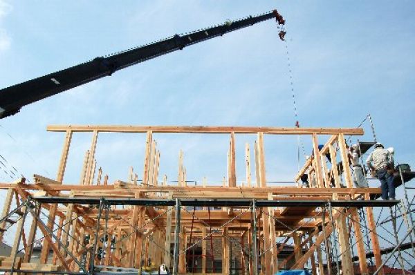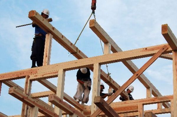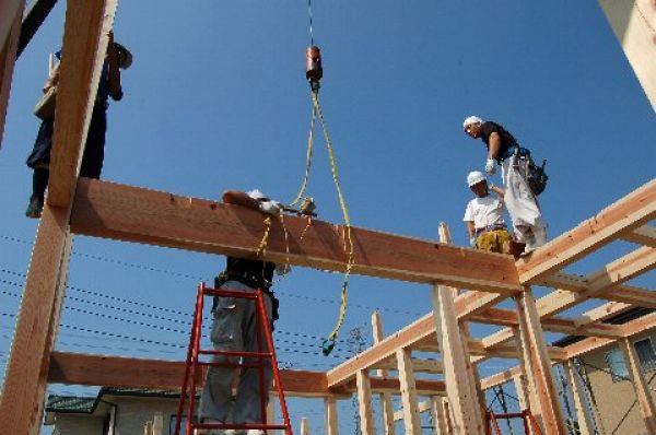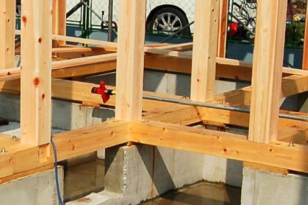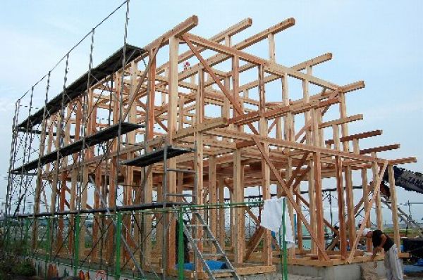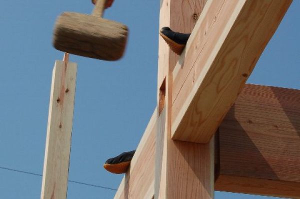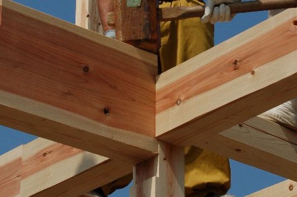 1階管柱と通し柱を始めに建て、2階の床梁、胴差を