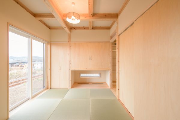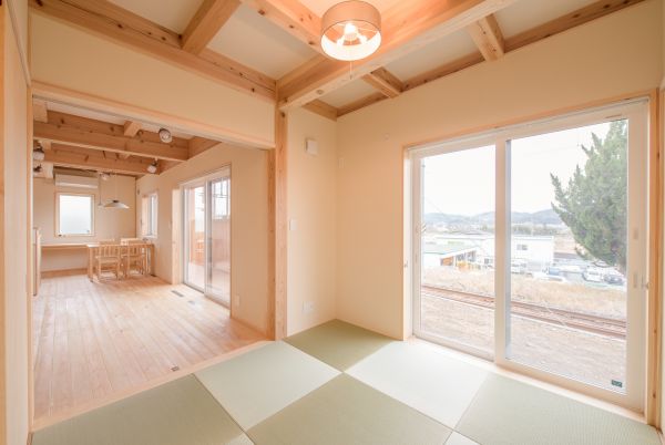 リビングとつながる和室、熊本産の畳と梁現しの格天井