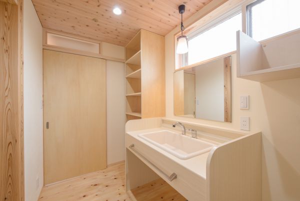 脱衣・浴室も2階に。造作による脱衣の可動棚