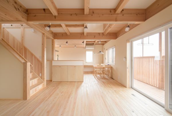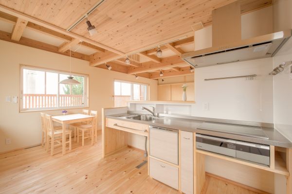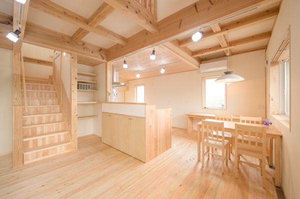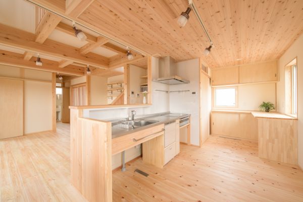 厚さ27mmの桧床板のダイニングとオリジナル造作キッチン