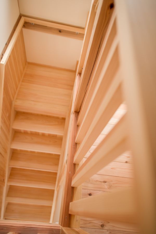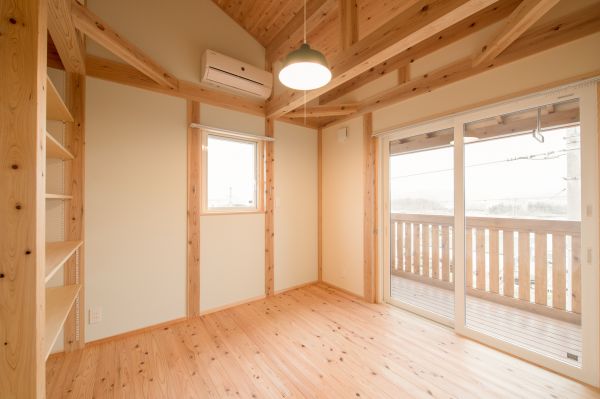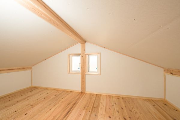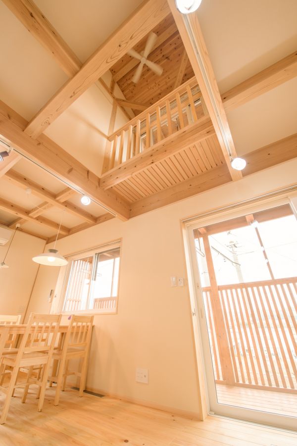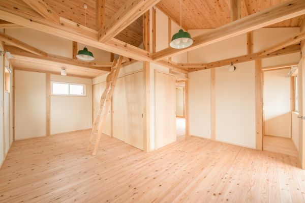 2階床は杉赤身板と杉赤身羽目板の2階勾配天井