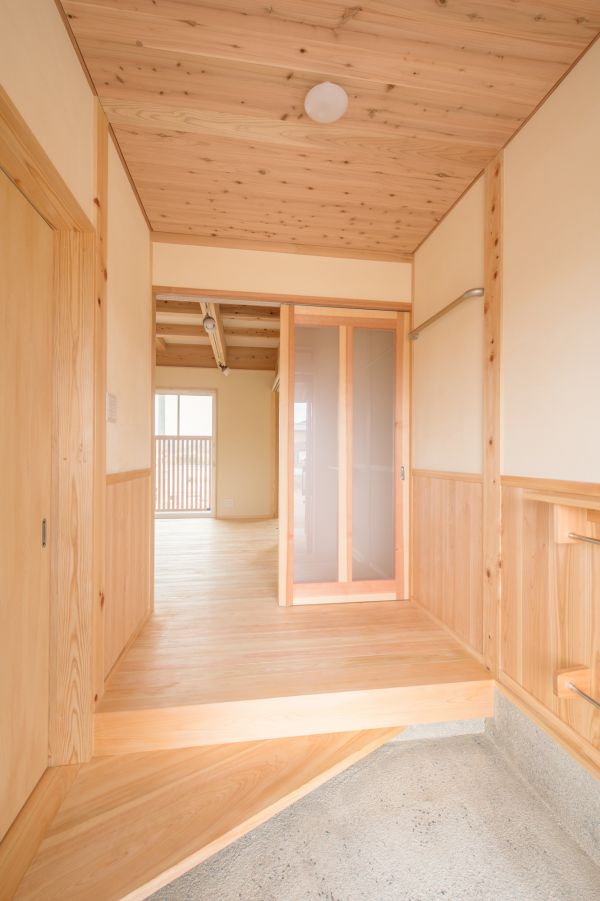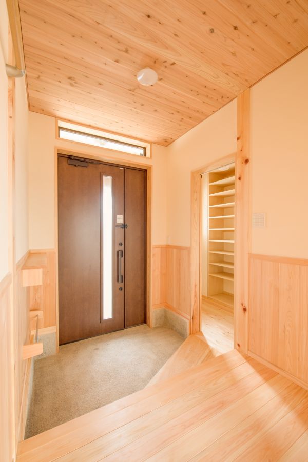 地域型住宅ブランド化事業の「つながる家」利用。長期優良住宅で耐震等級3、耐風等級2、Q値=1.6 無垢の木と珪藻土の塗り壁、ヒートポンプ床下蓄熱暖房、太陽光発電搭載、そして快適で省エネのパッシブデザインのお住まい