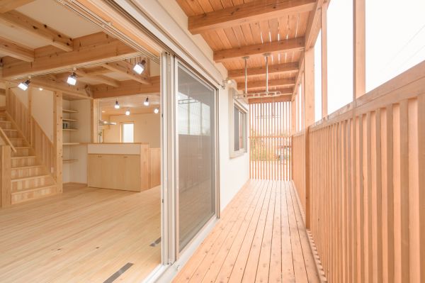 幅1,350mmのバルコニーは桧の床、桧のテスリ、杉の羽目板の壁