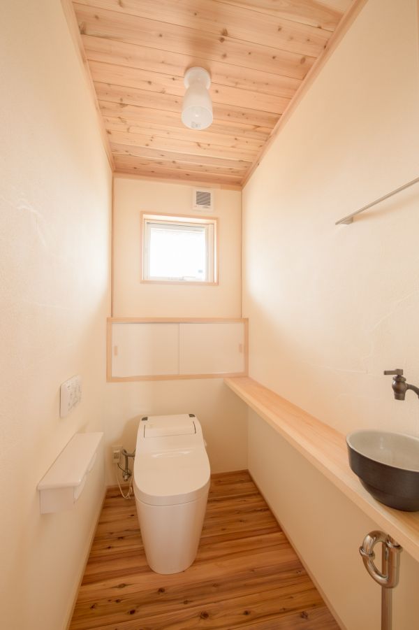 幅1200mmの広さのトイレは無垢のカウンターとレトロな手洗いセット