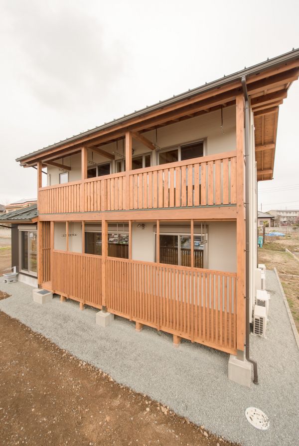 桧にプラネットのウッドコート塗りの広々二階バルコニー