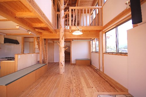 高台の傾斜地を好み、予算とこだわりの格差を知恵と時間で穴埋めし、理想の木の家を実現した住まい。リビング中央の枝付き大黒柱はお施主様ご家族が山に入って選んだヒノキ柱です。