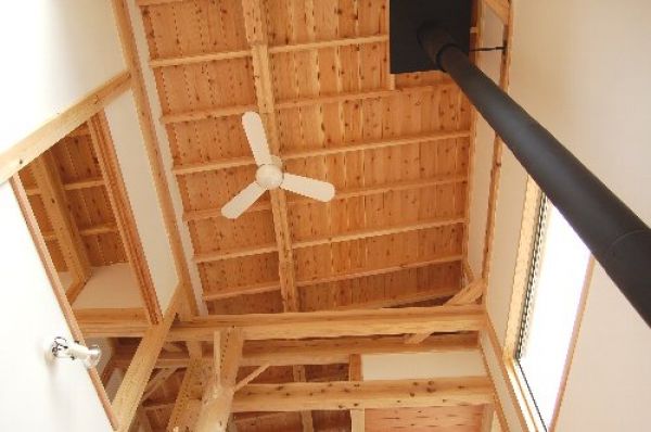 杉の化粧野地板現しの天井とシーリングファン