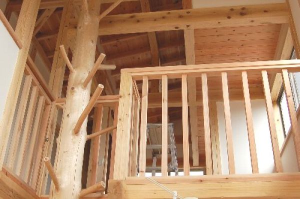吹抜けの枝付き柱と無垢のテスリ
