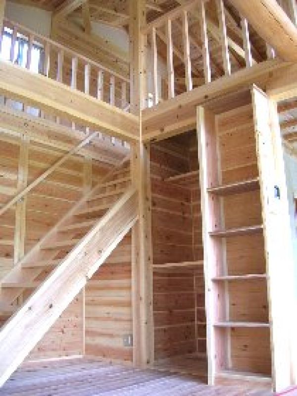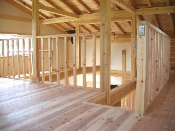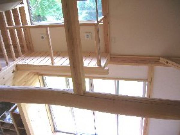 2階のオープンスペース ・檜で造作の吹き抜け手摺 ・天井は化粧垂木・野地板現しの勾配天井