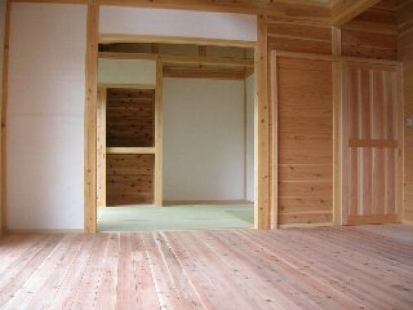杉床板のリビングと畳敷きの和室 ・厚さ27mmの杉の床板 ・畳は藁床、国産イグサ使用の天然泥染めたたみ