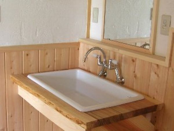 造り付け洗面台 ・無垢板のカウンター内に、大きなTOTOの病院流しを設置した洗面所 ・サワラ板の腰壁とお施主さんセルフ施工の珪藻土「はいから小町」