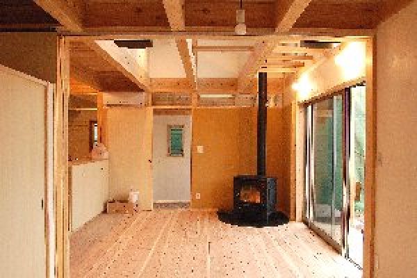 薪ストーブのあるオープンなリビングルーム ・玄関からはリビングルームを通り各部屋に、頭のよい子が育つ間取り ・左側は対面式のキッチンで、キッチンの器具が隠れる収納スペース