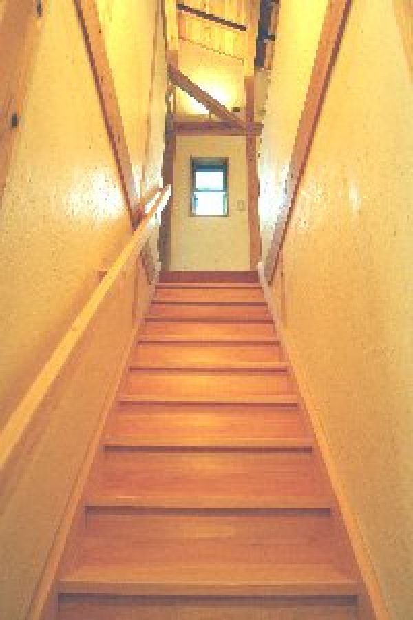 2階への階段は踏み板、蹴上げ板共に檜の無垢板を使った、ストレート階段