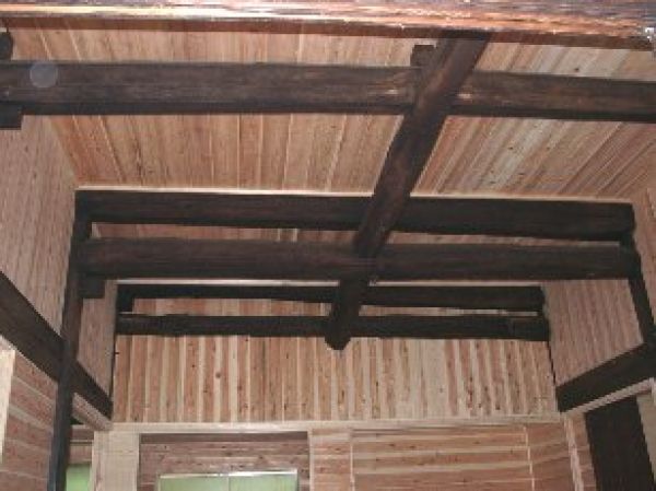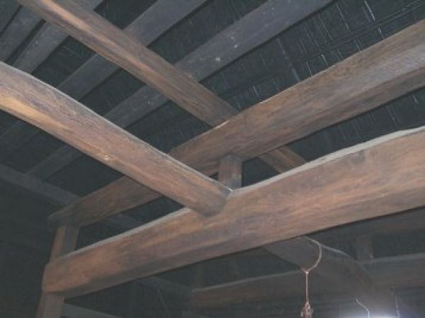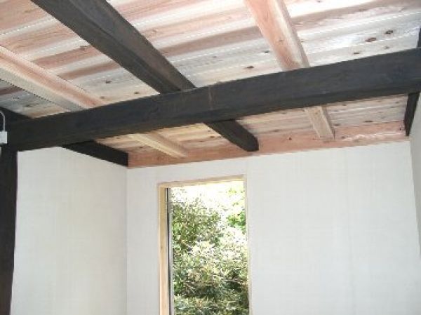 居間の天井は古い梁を現しにし、高い天井
