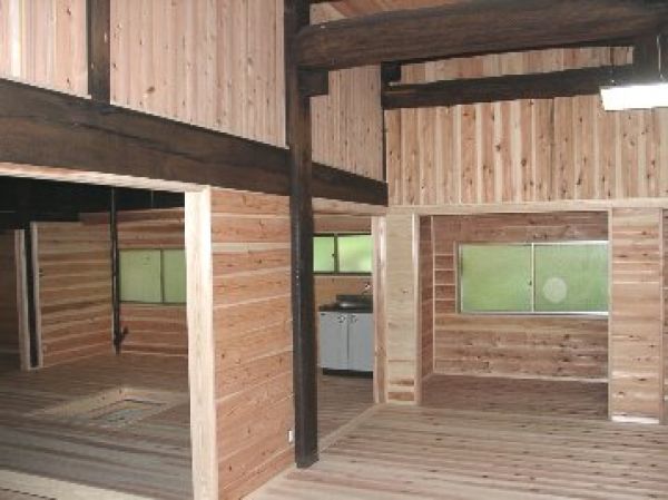 一期工事では水廻りの全般の改築を行い、今回(二期)は居間・囲炉裏間・玄関などの改修に着手 。壁は杉の羽目板を中心に、床にも杉の無垢板を使用。