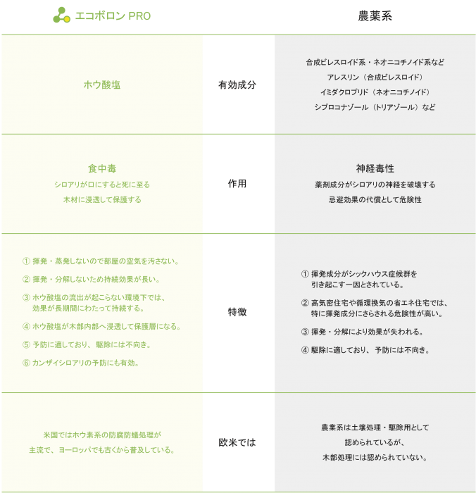 これらの薬剤は人体に少なからず悪影響を与えることは勿論、殺虫成分が揮発して、白アリや腐朽菌を攻撃するのが一般的であって、