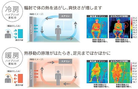 次世代輻射式空調システム「エコウィン」は、輻射熱を利用することで 床、壁、天井の温度がほぼ均一となるような温熱環境を実現します。
