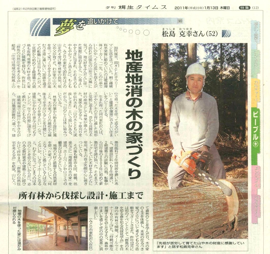 桐生タイムス「夢を追いかけて」 Written by 松島匠建 on 2018年11月09日. Posted in 新着情報 松島匠建代表松島克幸が、地元紙桐生タイムスに大きく載りました。 2011年01月13日 桐生タイムス(特集)「夢を追いかけて」 前 次へ
