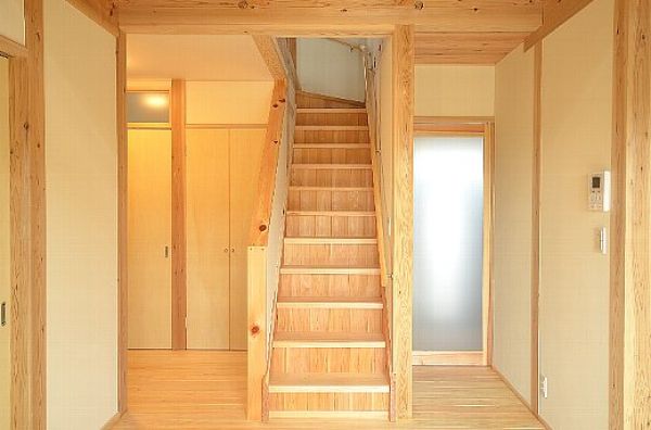 手刻み加工による桧無垢の階段と右手のアクリルガラス入り杉框戸