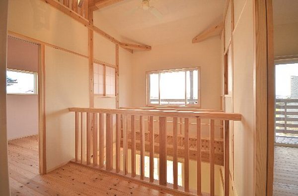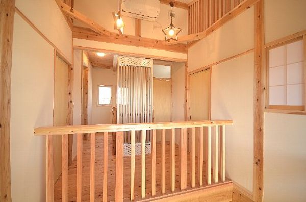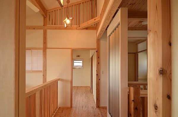 L・Dから和室 床板は厚27mmの桧無垢 リビングの上は吹き抜けに