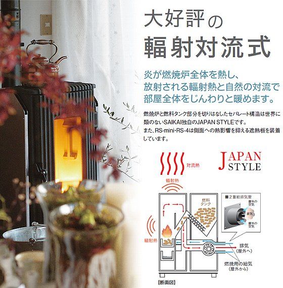 一方「輻射式」は、温度の立上りはゆっくりですが、遠赤外線効果によりじわじわとお部屋が暖まり、空気の乾燥も少なく快適で、私どもがお薦めのペレットストーブです。