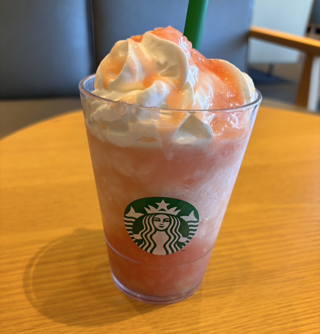 でもたまにはいいか(笑)。外は9月にさしかかっているのにめちゃくちゃ暑いし!暑いからフラペチーノは余計においしく感じるし!今の時期は桃、もう少しすると梨でめちゃくちゃ良い季節です!