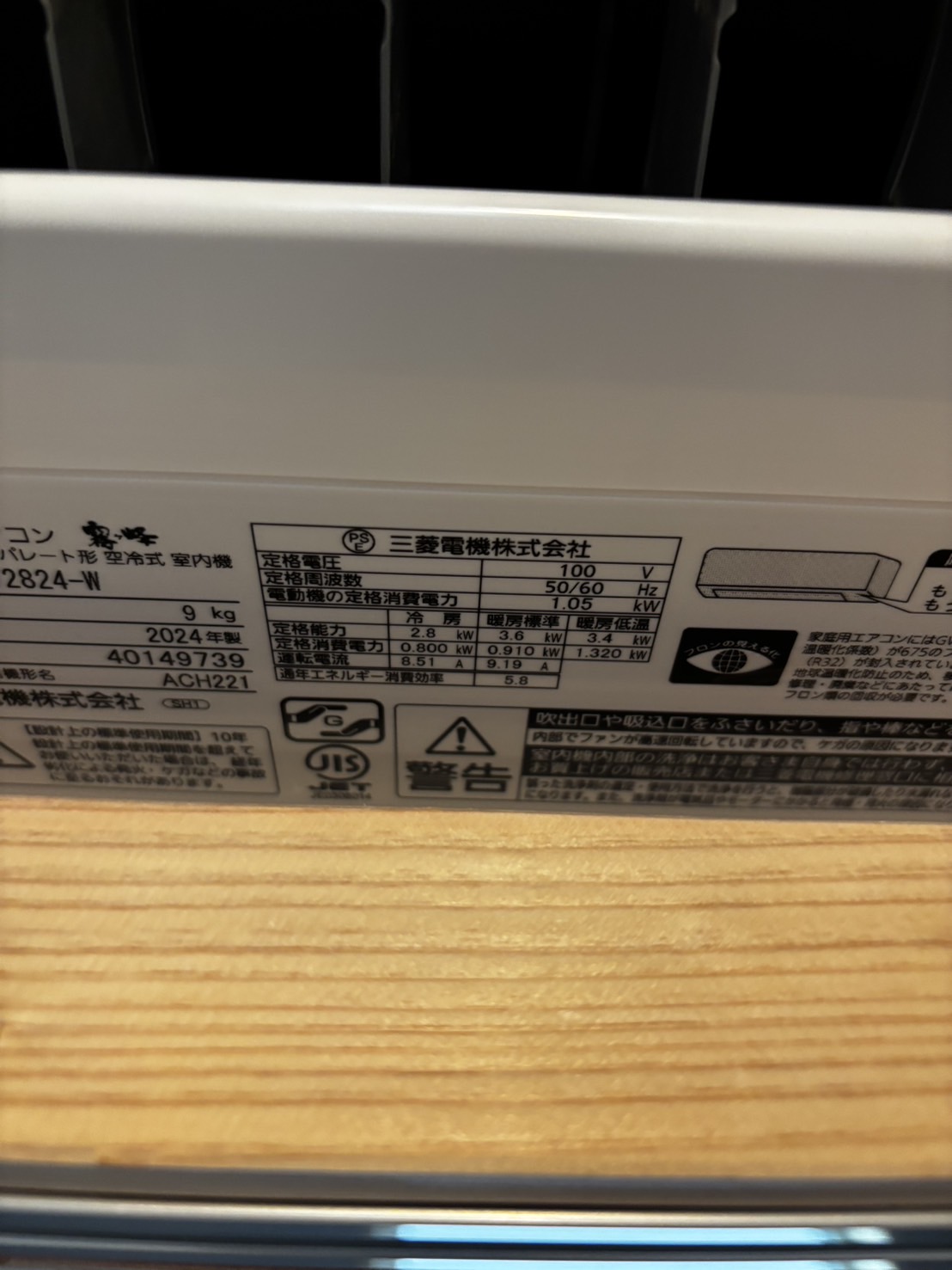 2階ホールに設置されている10畳用の三菱のエアコン。冷房の定格能力は2.8kW。