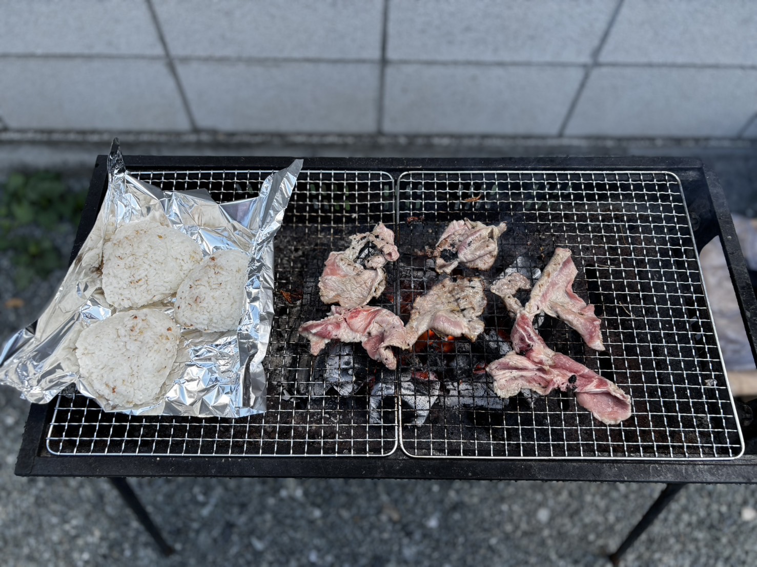 炭火で焼いた肉と焼きおにぎりとうまいやつで『かんぱ~い!!!』