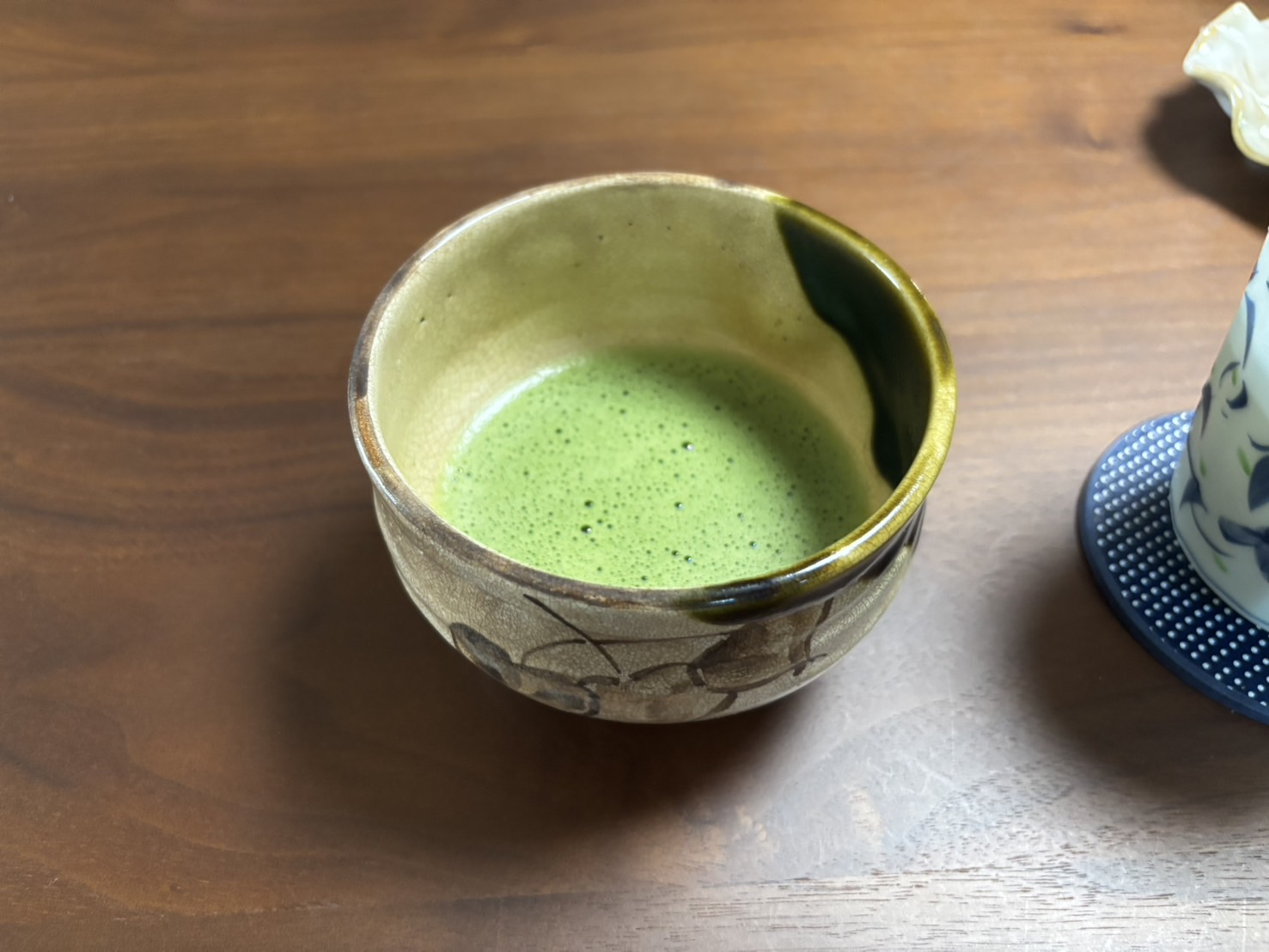 草刈りをしてくれたお礼にと、お客さんの趣味であるお茶『お抹茶』をたてて入れてくださいました。