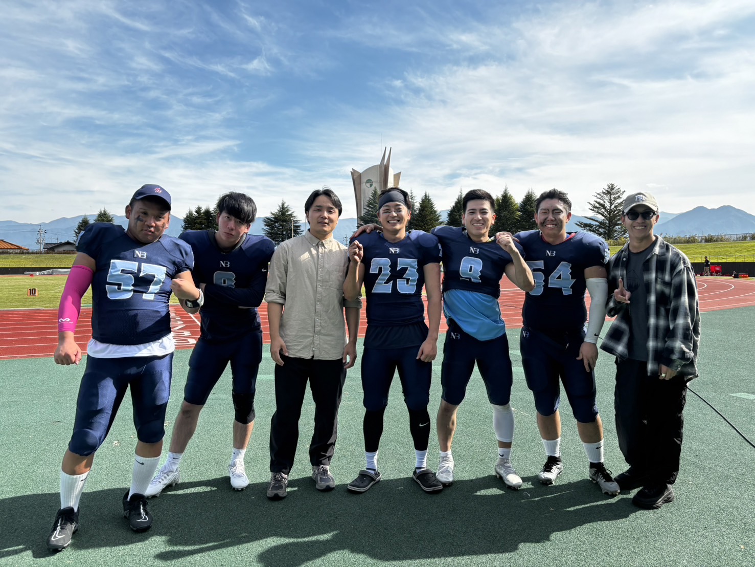 善光寺ボウルというのは、長野県にある社会人のアメリカンフットボールチームと、長野県にある信州大学アメリカンフットボール部がそれぞれ試合を行うイベントです。社会人チームは「長野ブルーパーズ」と言って20代前半の選手もいれば50代の選手もいるようなチームで、普段は皆さんお仕事や学生(大学院)をしているので週一回集まって練習や試合をやっています。Xリーグに所属しているようなプロのチームではないですが、プライベートリーグというところに所属している団体です。