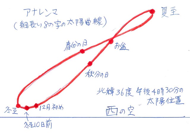 1年で陽が最も短いのは「冬至10日前」と言いますが、これを証明するのが下のアナレンマです。 地球が太陽を公転する軌道には多少の歪みがあって楕円の軌道となり、毎日同じ場所で同じ時刻に太陽の位置を記すと、夏至と冬至が一直線にならず8の字を描き、この現象をアナレンマと言います。