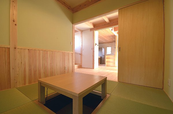 和室の床は目積畳、そしてサワラの腰板張りと、淡グリーン色のナテュール塗り壁。