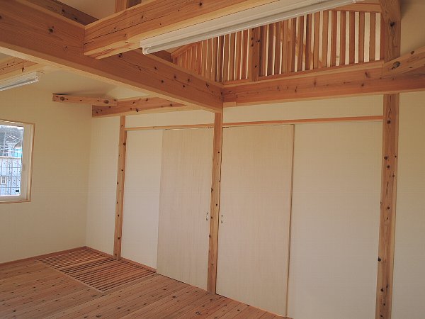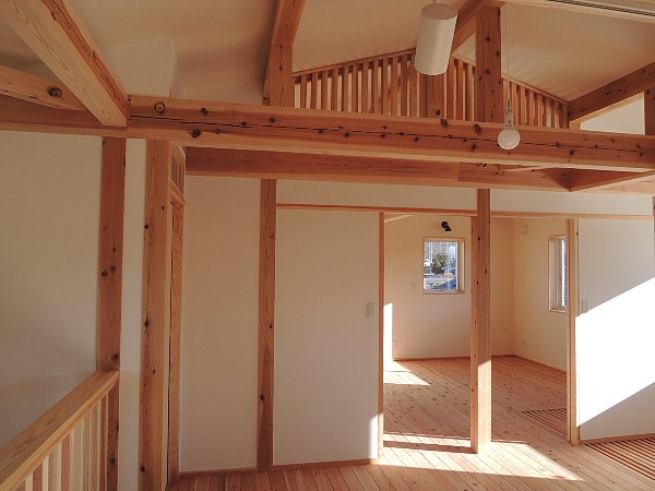 2階のホール(ファミリースペース)とその奥の寝室、そして杉赤身の床板。