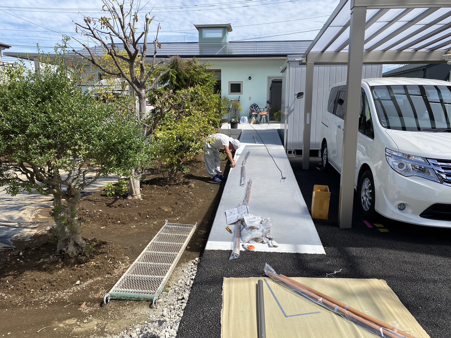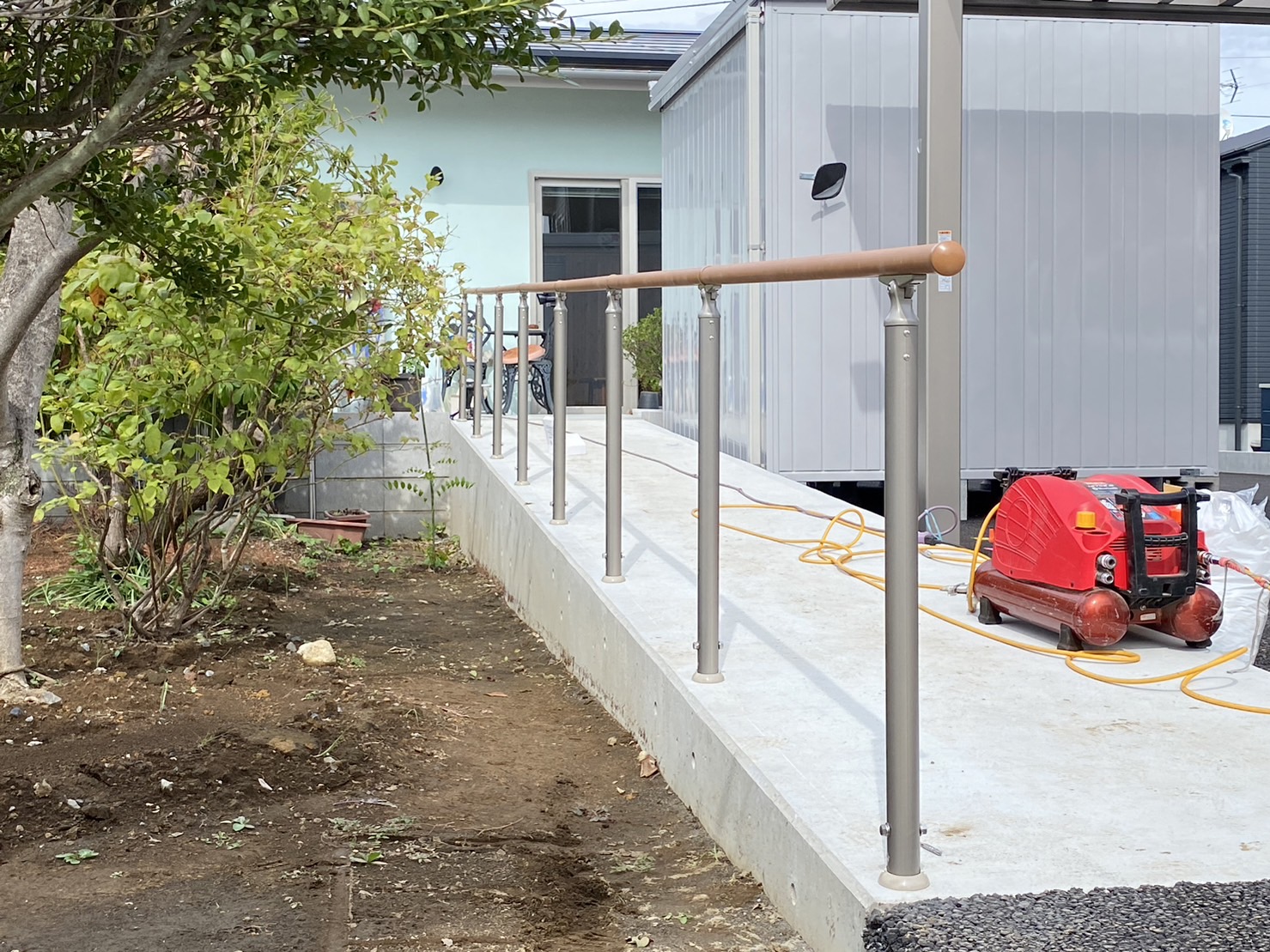 昨日、伊勢崎市で新築したお家の庭のスロープに手すりを設置する工事に中澤建設の大工さんである原田さんと行って来ました。ここにお住いのご家族の中に車椅子使用者の方がいるので、室内も屋外も極力段差のないようバリアフリーに配慮されています。