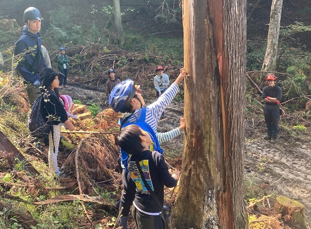 ↑ これから伐り倒す杉の大木は、数年前に熊の皮剥ぎ被害による杉の木で、熊の爪痕が残る木の表面を確かめる子供たちです。