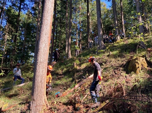 ↑ 秋山林業の秋山さんと、地域おこし協力隊の吉沢さんの2人にて、杉の木の伐倒が行われ、その上で見学している参加者皆さんです。