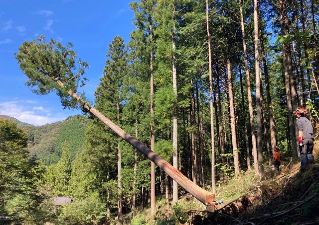↑ 樹齢56~7年の杉の大木が倒れていく瞬間で、このあとドスン!と倒れた木の地響きを感じて、最高にしびれた皆さんでした。