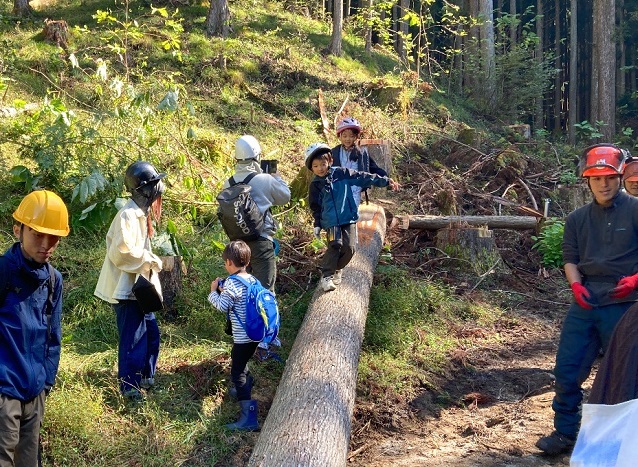 そんな秋晴れの先週の土曜日、10月14日にみどり市東町沢入の山中にて、秋のイベント「山のパワーを感じる!伐採見学会」が開催され、大人も子供も大喜びの感動の1日となりました。