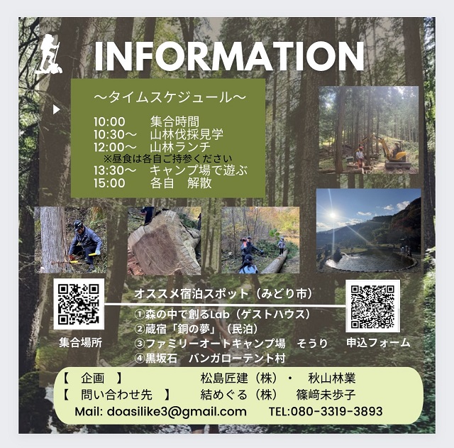 みどり市の山で、そんな木を活かし、山を守り、そして山に生きる者たちと、みどり市の山での伐採を見学し、木を知り山を知り、資源と経済が循環する世の中を語りましょう。