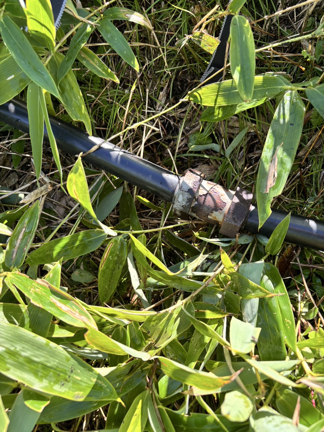 道なき道、そして急斜面でのこの上の写真にある繋ぎ目の修繕はかなり大変でした。ここを繋ぎ合わせ、水が流れ始めたと感じた瞬間の達成感は気持ちが良かったです。しかし、水場まで戻るまでは油断ができません。他にも水が出ない原因があればまた上り直しだからです。ドキドキして水場まで下っていくと。。。