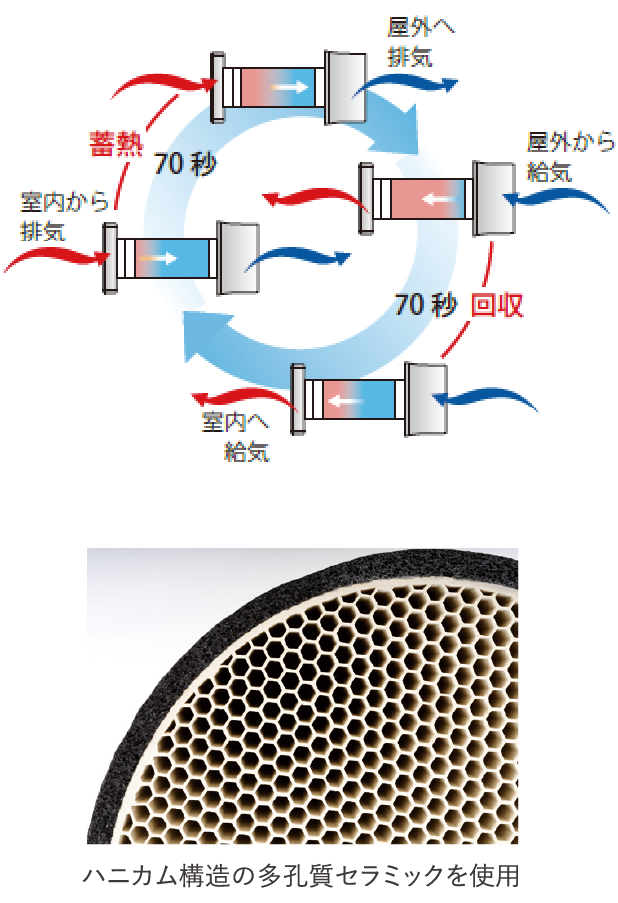 蓄熱エレメントに多孔質セラミックを使用 ・・・ハニカム構造の多孔質セラミックは蓄熱性が高く、湿度も回収します。 また、掃除機での清掃や水洗いなど簡単なメンテナンスで性能を長期間維持します。